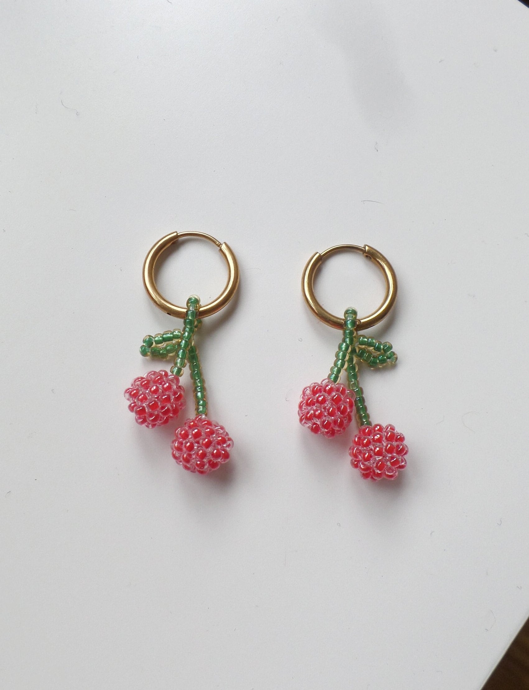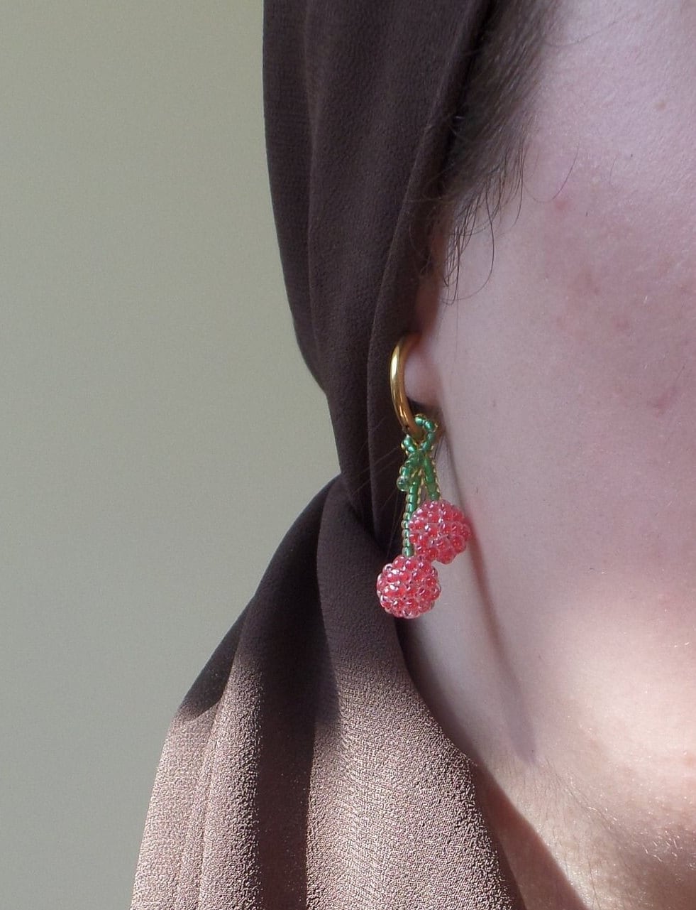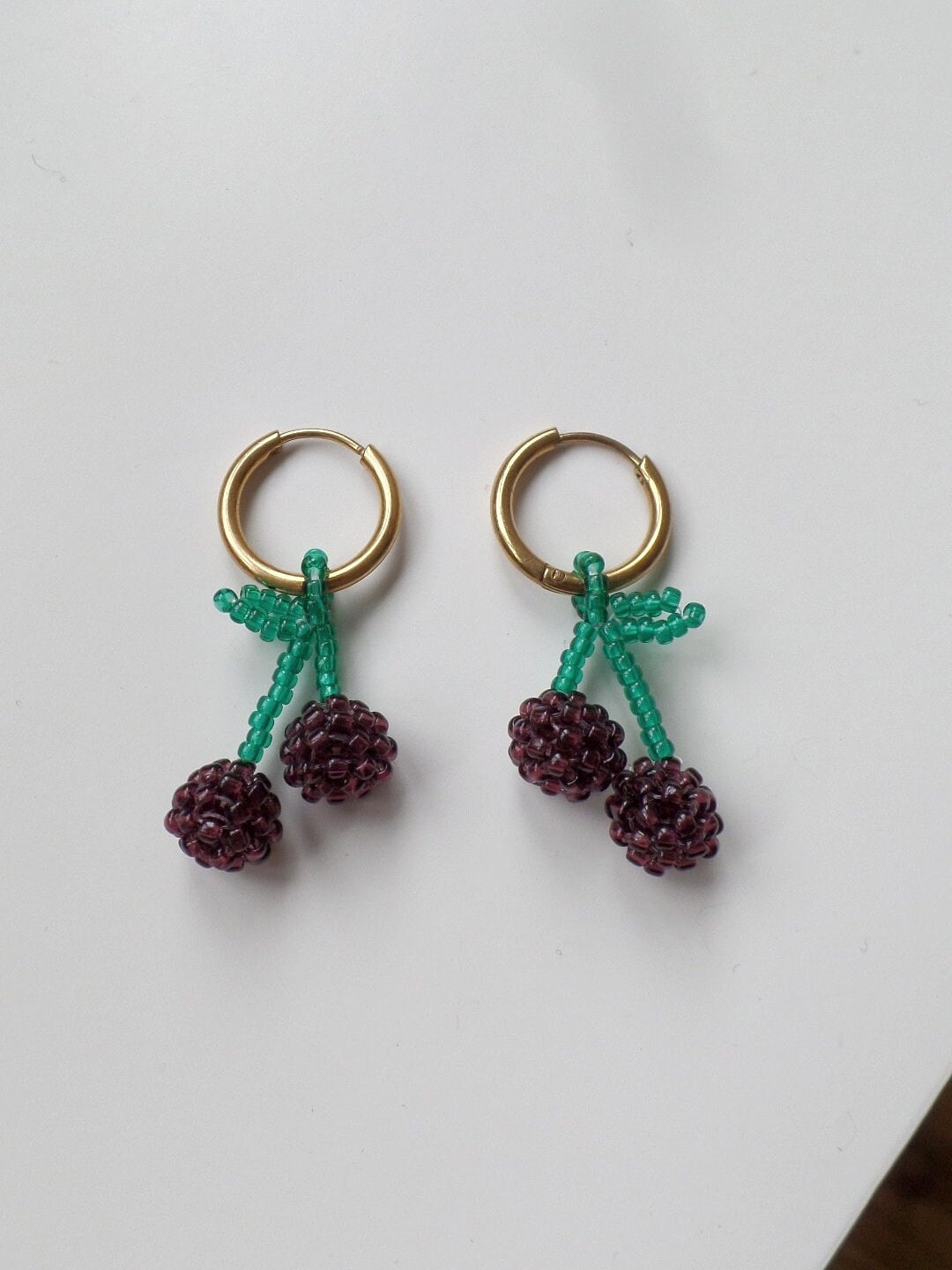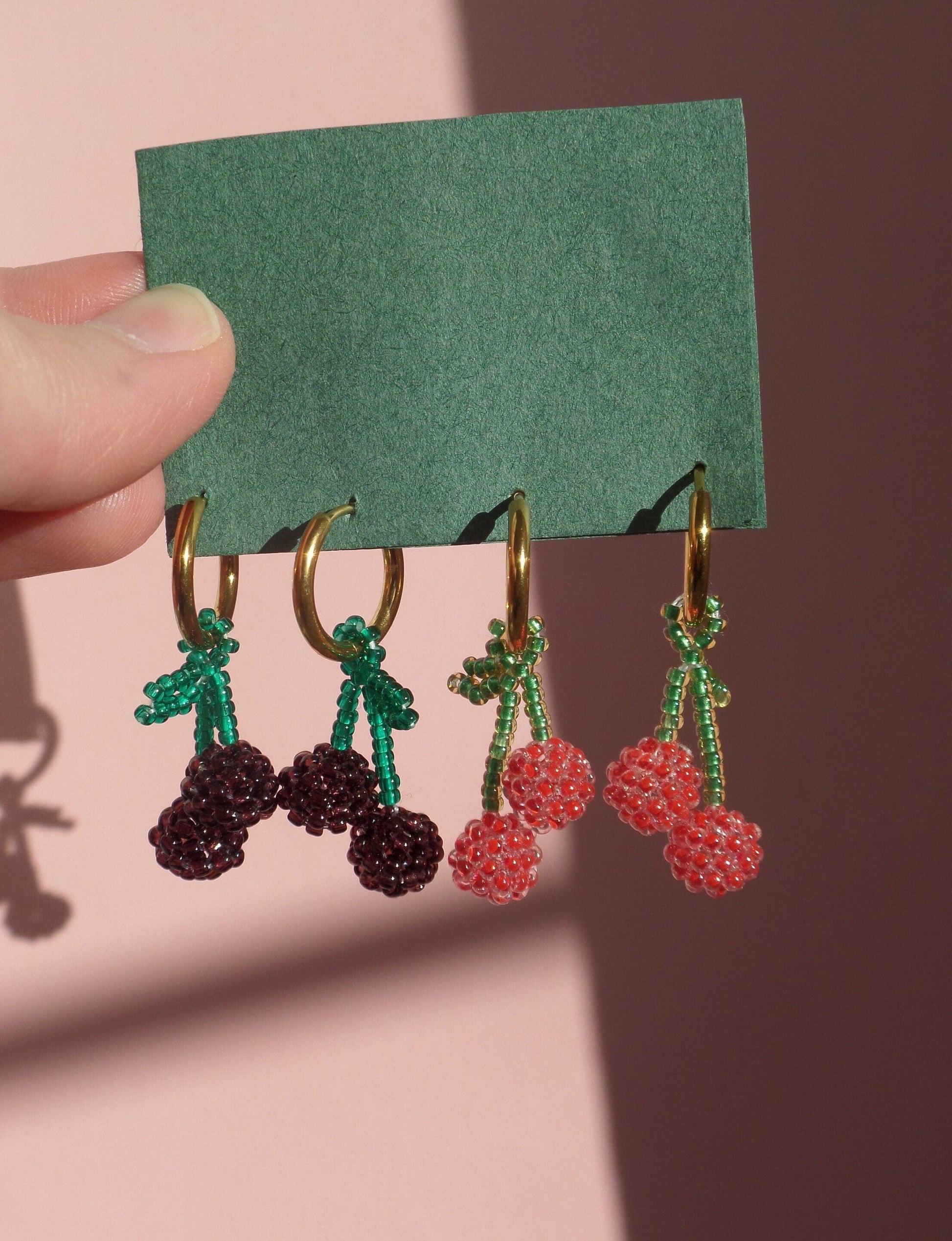 These handwoven cherry earrings are made of the highest quality glass beads. The gold hoops are gold-plated and the silver hoops are surgical-grade stainless steel.